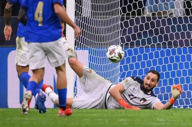 看得出来,他的内心也是有波动的。平心而论,意大利的两个失球,唐纳鲁马都没有太直接的责任,但是在第一个失球后仅仅过了几分钟,他面对对方一次并没有太大威胁的一脚远射直接上演了“黄油手”,皮球脱手之后重重地砸在了门柱上,意大利国门逃过一劫。纵观唐纳鲁马至今的职业生涯,很少犯这种类型的脱手失误,也许只有2018年的意大利杯决赛中米兰最后一个失球能够与这个失误相提并论,当时年仅19岁的唐纳鲁马将曼朱基奇绵软无力的头球直接扑到了贝纳蒂亚的脚下,送上了“乌龙”助攻。